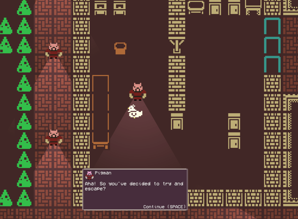 Using C#, I had to learn about and create mechanics such as cones of vision using ray casting, NPC patrolling, character dialogs as well as character abilities such as hiding in barrels and dashing. Managing my time was crucial in making sure I had enough time to polish the game and submit it.
